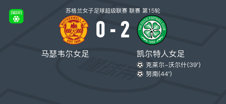 北京时间1月19日,苏格兰女子足球超级联赛第15轮,马瑟韦尔女足主场迎战凯尔特人女足。比赛中,凯尔特人女足率先打破僵局,克莱尔-沃尔什攻入一球,为球队取得领先。随后,摩根-克罗斯送出助攻,努南接应破门,进一步扩大比分优势。凯尔特人女足凭借上下半场的两粒进球,客场2比0战胜马瑟韦尔女足。