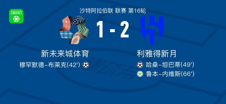 利雅得新月2-1逆转新未来城体育,鲁本-内维斯点射,哈桑-坦巴蒂破门