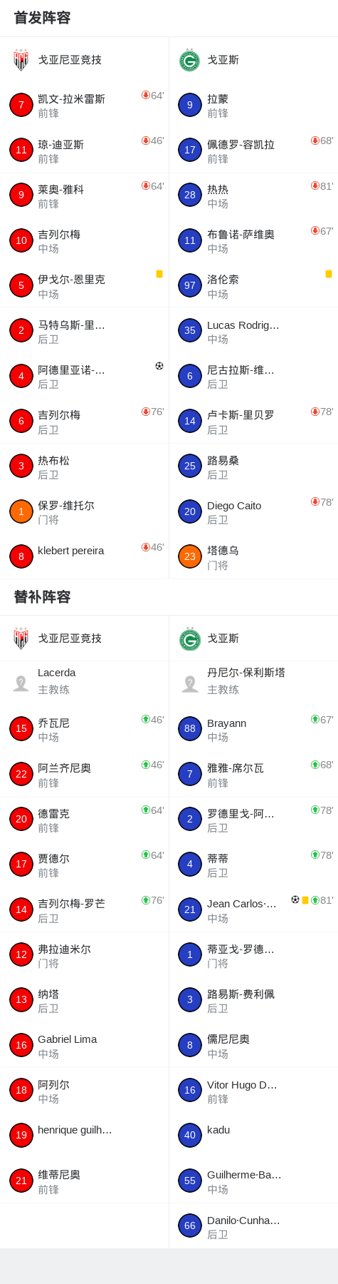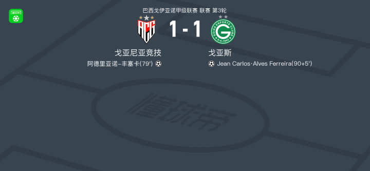 戈亚尼亚竞技1-1戈亚斯,阿德里亚诺-丰塞卡破僵,Jean Carlos·Alves Ferreira扳平比分