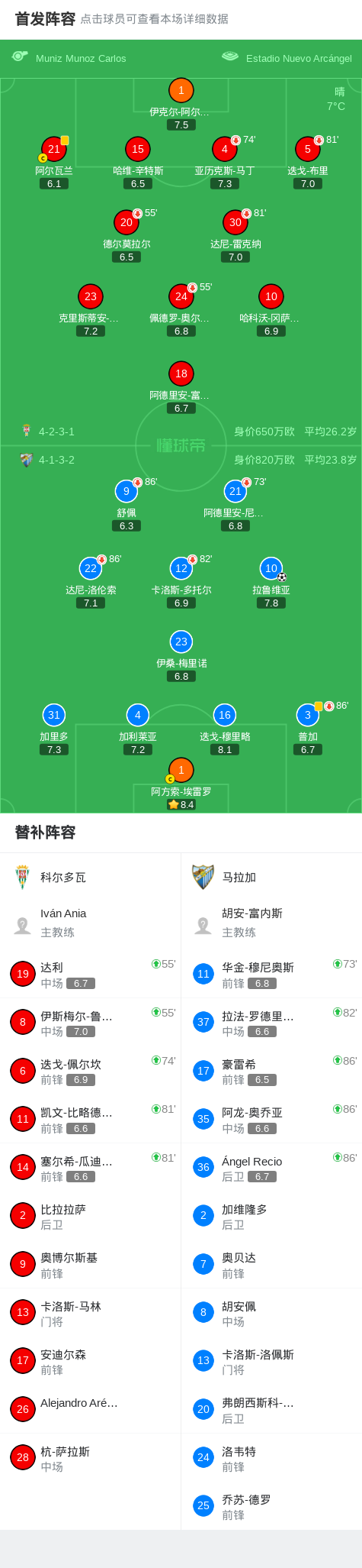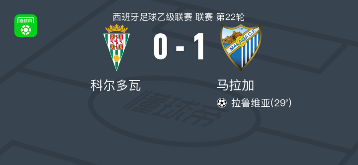 马拉加1-0科尔多瓦,拉鲁维亚制胜战报bot @懂球帝01-19 05:58北京时间1月19日,西班牙足球乙级联赛第22轮,科尔多瓦主场迎战马拉加。比赛中,马拉加球员拉鲁维亚攻入全场唯一进球,帮助球队取得领先。凭借此球,马拉加客场1比0战胜科尔多瓦,全取三分。点击查看本场比赛详细数据>>点击查看西乙完整积分榜>>精彩瞬间第29分钟,马拉加球员拉鲁维亚打入一球。 球队阵容 技术统计 展开更多