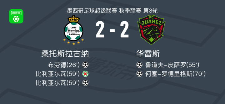 北京时间1月19日墨西哥足球超级联赛 秋季联赛 第3轮,桑托斯拉古纳主场对阵华雷斯。桑托斯拉古纳布劳德破门,比利亚尔瓦破门。华雷斯鲁道夫-皮萨罗破门,何塞-罗德里格斯破门。最终比分桑托斯拉古纳 2-2 华雷斯。