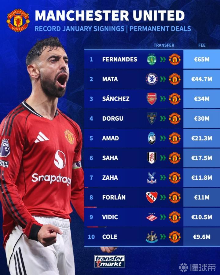 德转列曼联队史冬窗最贵引援TOP10:B费、马塔、桑切斯前3