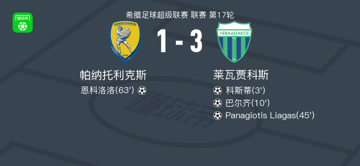 北京时间1月20日,希腊足球超级联赛第17轮展开较量,帕纳托利克斯主场迎战莱瓦贾科斯。比赛伊始,莱瓦贾科斯迅速打开局面,科斯蒂接巴尔齐助攻率先破门。随后巴尔齐本人也取得进球,进一步扩大领先优势。临近上半场结束,巴尔齐再度送出助攻,Panagiotis Liagas得球后建功,帮助球队确立三球领先。易边再战,帕纳托利克斯由恩科洛洛接默坦传球完成破门,为球队扳回一城。此后双方均无建树,最终全场比赛结束,帕纳托利克斯以1比3不敌莱瓦贾科斯。