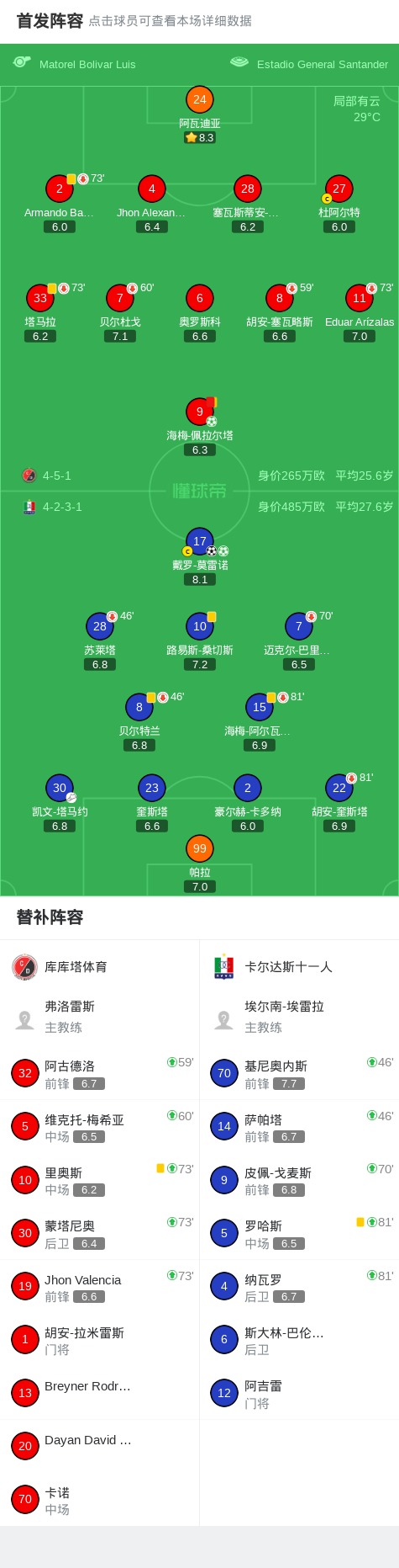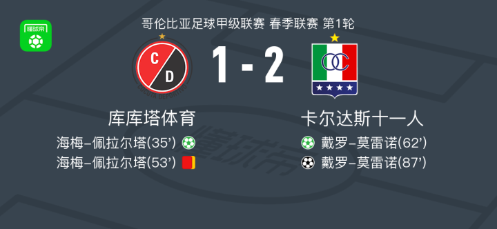 北京时间1月20日哥伦比亚足球甲级联赛 春季联赛 第1轮,库库塔体育主场对阵卡尔达斯十一人。库库塔体育海梅-佩拉尔塔破门。卡尔达斯十一人戴罗-莫雷诺梅开二度。最终比分库库塔体育 1-2 卡尔达斯十一人。