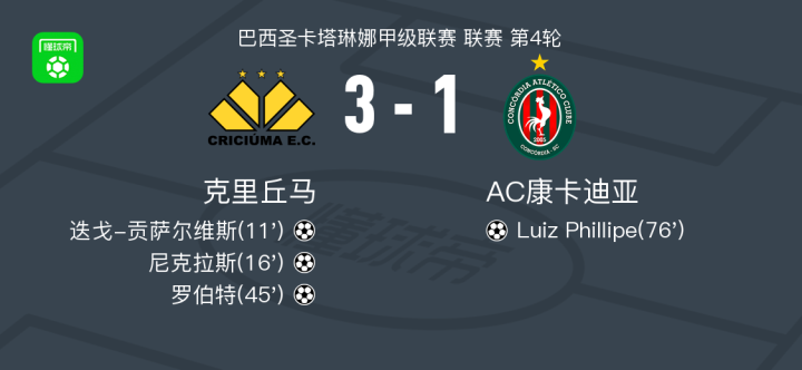 北京时间1月20日,巴西圣卡塔琳娜甲级联赛第4轮展开较量,克里丘马坐镇主场迎战AC康卡迪亚。比赛中,克里丘马率先发力,迭戈-贡萨尔维斯接应进攻打破僵局。随后尼克拉斯再下一城,进一步扩大领先优势。临近上半场结束,罗伯特破门得分,帮助球队建立三球优势。下半场,AC康卡迪亚由Luiz Phillipe把握机会扳回一球。此后双方均无建树,最终克里丘马以3比1战胜AC康卡迪亚。