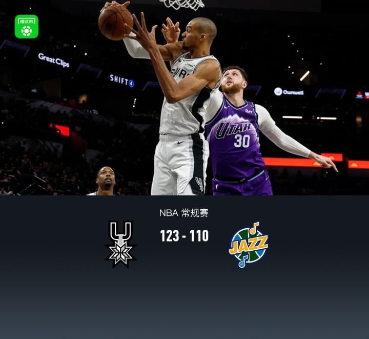 第四节,开节马刺文班亚马、哈珀、布莱恩特相继得分领先至20分,节中马刺继续一波三分雨领先至24分,随后马刺文班亚马提前打开休息,爵士反扑缩小分差,最终马刺123-110战胜爵士。