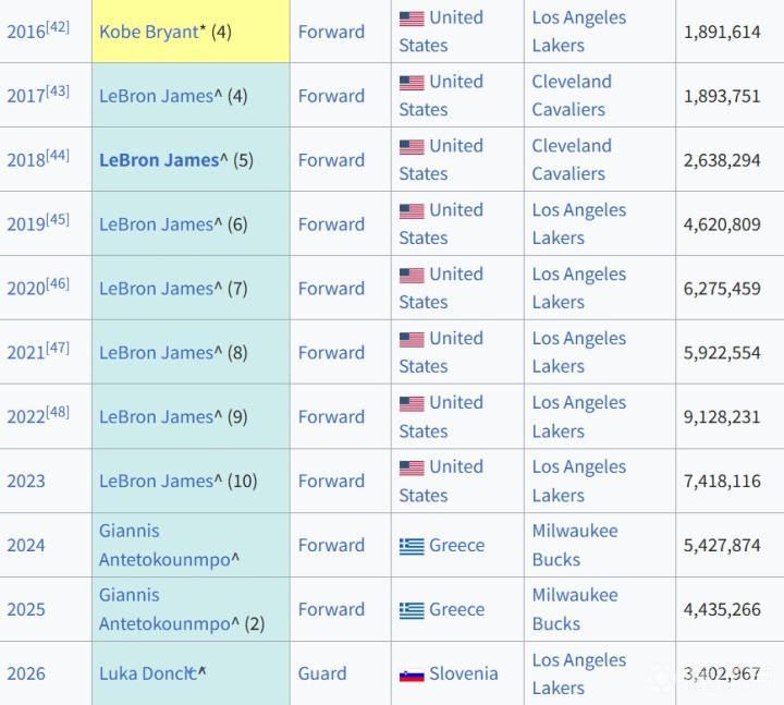 值得一提的是,在此前10年的全明星票选中,东契奇的队友詹姆斯7次夺得票王,此外字母哥2次夺魁,科比则在退役赛季夺得票王。