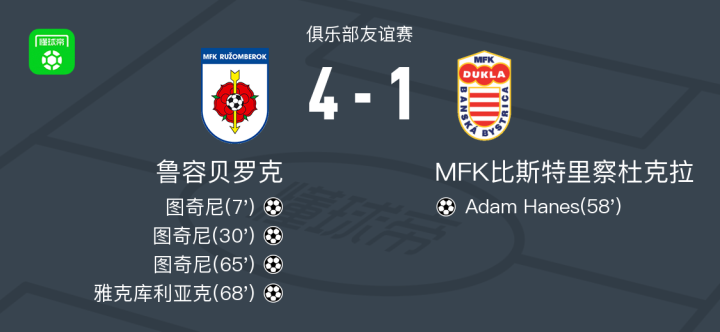 鲁容贝罗克4-1大胜MFK比斯特里察杜克拉,图奇尼帽子戏法,雅克库利亚克破门