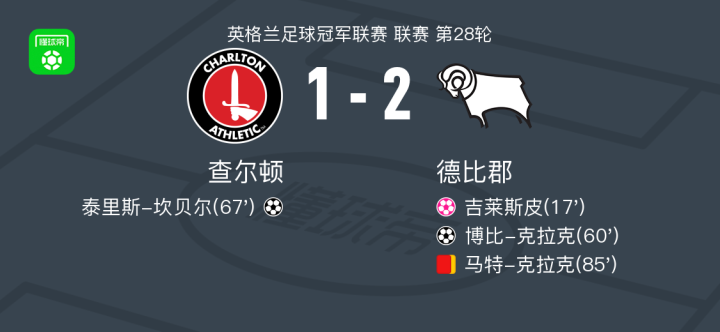 北京时间1月21日英格兰足球冠军联赛 联赛 第28轮,查尔顿主场对阵德比郡。查尔顿泰里斯-坎贝尔破门,吉莱斯皮自摆乌龙。德比郡博比-克拉克破门。最终比分查尔顿 1-2 德比郡。