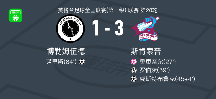 北京时间1月21日,英格兰足球全国联赛(第一级)第28轮,博勒姆伍德主场对阵斯肯索普。奥康奈尔不慎自摆乌龙,罗伯茨接怀特豪尔助攻破门,威斯特布鲁克接登顿助攻再入一球,诺里斯在奥康奈尔助攻下扳回一城。最终,博勒姆伍德以1比3不敌斯肯索普。