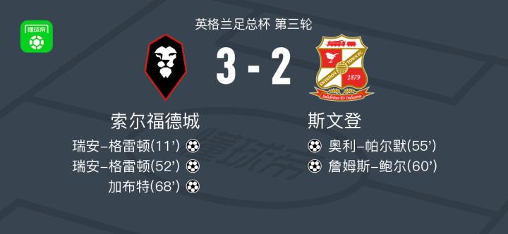 索尔福德城3-2斯文登,瑞安-格雷顿双响,加布特破门