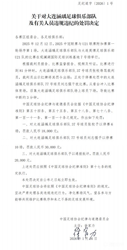 北京时间1月21日,中国足协官方发布处罚公告,大连涵瑀球员张校因辱骂裁判被禁赛6场+罚款,刘志强干扰比赛被禁赛10场+罚款。