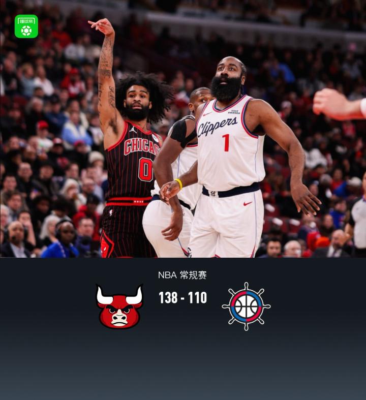 第四节公牛科比-怀特拿下15分,快船泰泰-华盛顿拿下11分,最终公牛138-110战胜快船