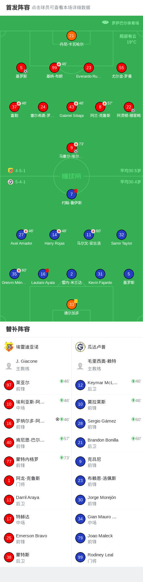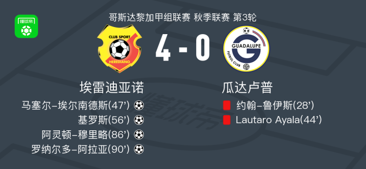 哥斯达黎加甲组联赛秋季联赛第3轮,埃雷迪亚诺主场对阵瓜达卢普。比赛进行中,瓜达卢普球员约翰-鲁伊斯与Lautaro Ayala相继被罚离场。随后,马塞尔-埃尔南德斯率先破门,基罗斯扩大比分,阿灵顿-穆里略再入一球,罗纳尔多-阿拉亚锦上添花。最终埃雷迪亚诺以4比0取胜。