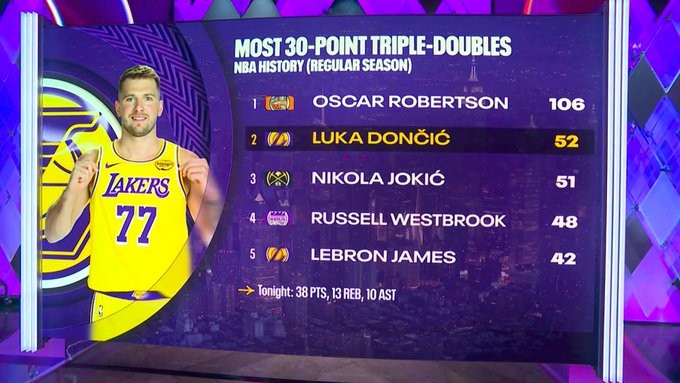 值得一提的是,这是东契奇职业生涯第52次砍下30+三双,他也“趁机”超越了本场休战的东欧好友约基奇,独享历史第二位。