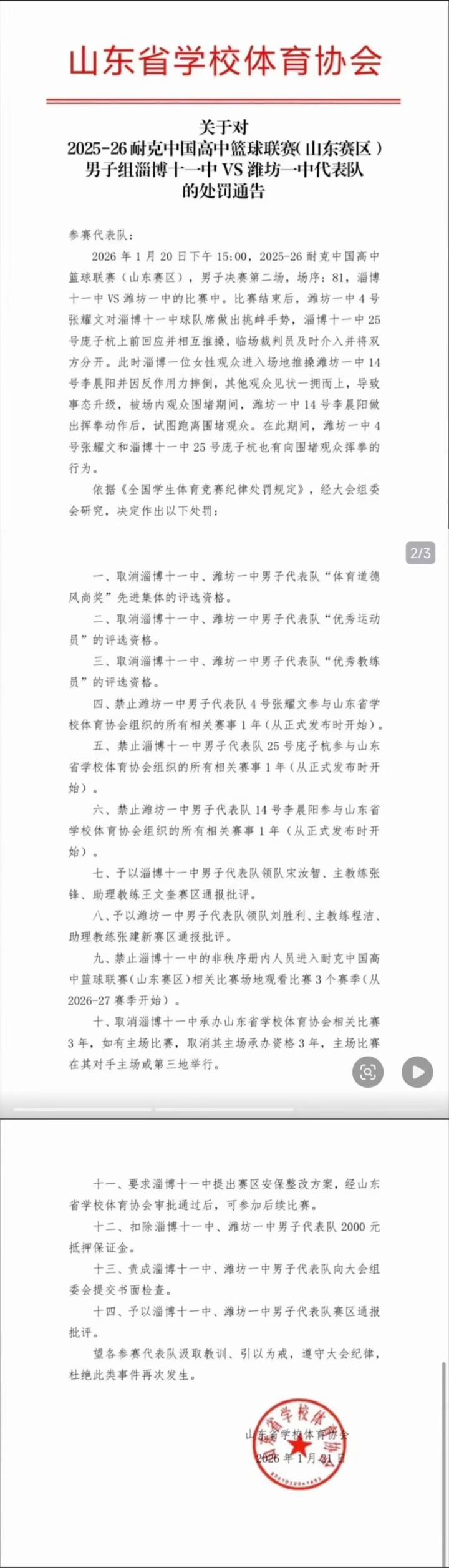今日,有关该事件的罚单流出,其中,3名参与球员被禁赛1年;两队领队、主教练被通报批评;淄博十一中的非秩序册内人员禁止进入耐克中国高中篮球联赛(山东赛区)相关比赛场地观看比赛3个赛季(从2026-27赛季开始);取消淄博十一中承办山东省学校体育协会相关比赛3年,如有主场比赛,取消其主场承办资格3年,主场比赛在其对手主场或第三地举行;扣除两队抵押保证金2000元。