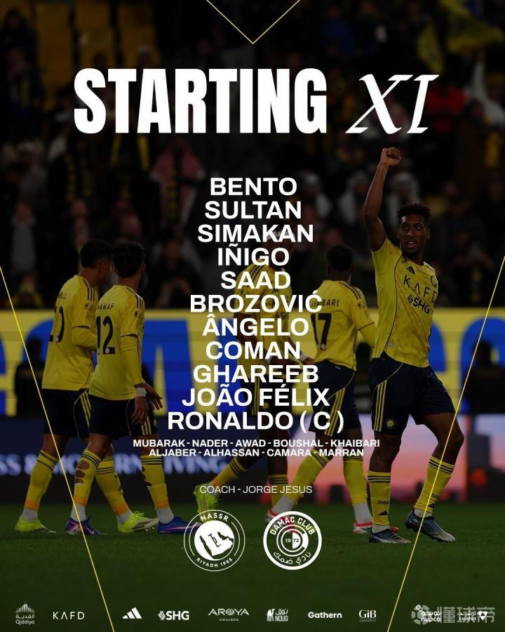 利雅得胜利首发:24-本托、96-纳赛尔、26-伊尼戈、3-西马坎、2-加奈姆、29-加里卜、11-布罗佐维奇、20-安热洛、21-科曼、7-C罗、79-菲利克斯