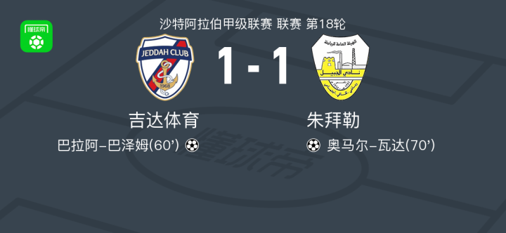 吉达体育1-1朱拜勒,巴拉阿-巴泽姆打破僵局,奥马尔-瓦达扳平