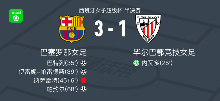 北京时间1月22日西班牙女子超级杯 半决赛,巴塞罗那女足对阵毕尔巴鄂竞技女足。巴塞罗那女足巴特列破门,伊雷妮-帕雷德斯破门,帕约尔破门。毕尔巴鄂竞技女足内瓦多破门。最终比分巴塞罗那女足 3-1 毕尔巴鄂竞技女足。