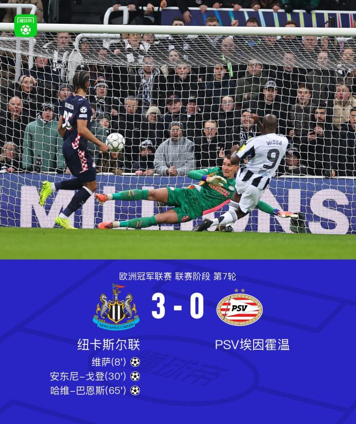 北京时间1月22日,欧洲冠军联赛联赛阶段第7轮,纽卡斯尔联迎战PSV埃因霍温。比赛开始后,乔林顿送出助攻,维萨接球后冷静施射破门,为球队取得领先。随后,维萨在前场完成精彩配合,将球精准送入对方禁区,安东尼-戈登抓住机会再下一城。进入下半场,哈维-巴恩斯凭借个人能力突破防线,攻入第三粒进球,进一步扩大比分优势。全场比赛结束,最终比分为纽卡斯尔联 3-0 PSV埃因霍温。