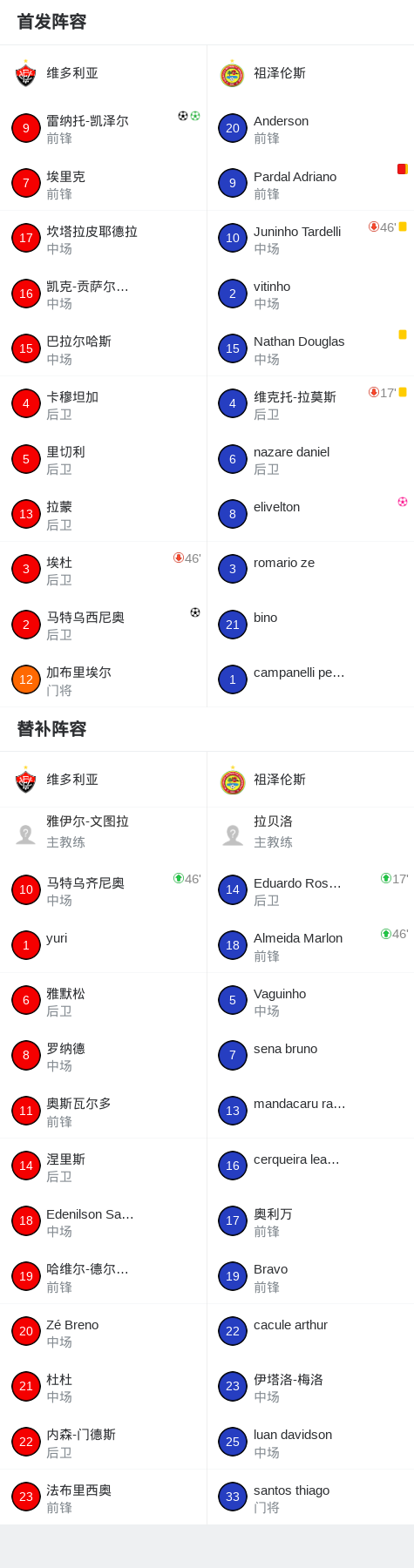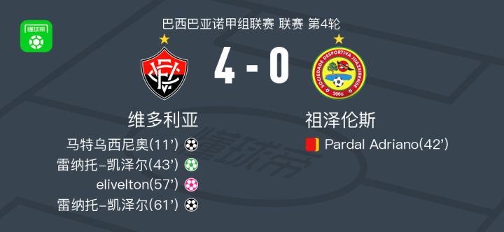 维多利亚4-0大胜祖泽伦斯,雷纳托-凯泽尔双响,马特乌西尼奥破门