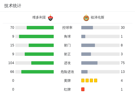 北京时间1月22日,巴西巴亚诺甲组联赛第4轮,维多利亚坐镇主场迎战祖泽伦斯。比赛开始后,马特乌西尼奥率先为维多利亚打破僵局,帮助球队取得领先。随后,祖泽伦斯球员Pardal Adriano累计两张黄牌被罚离场,场上局势进一步向主队倾斜。上半场临近结束前,雷纳托-凯泽尔主罚点球命中,扩大比分优势。进入下半场,祖泽伦斯球员elivelton不慎将球打入自家球门,客队防线再遭打击。不久后,雷纳托-凯泽尔再度破门,完成个人本场第二粒进球。最终全场比赛结束,维多利亚以4比0战胜祖泽伦斯。