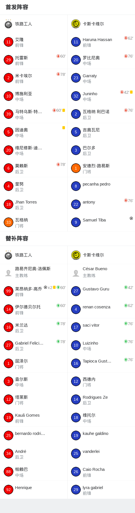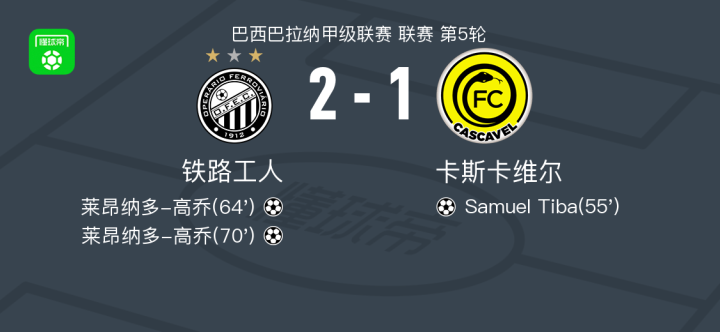 北京时间1月22日,巴西巴拉纳甲级联赛第5轮,铁路工人坐镇主场迎战卡斯卡维尔。比赛中,卡斯卡维尔由Samuel Tiba率先破门,取得领先。随后,铁路工人展开反击,莱昂纳多-高乔连入两球,帮助球队实现逆转。最终,铁路工人以2比1战胜卡斯卡维尔,全取三分。
