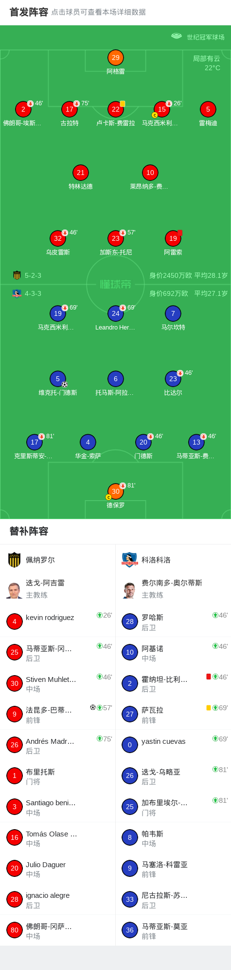北京时间1月22日俱乐部友谊赛,佩纳罗尔对阵科洛科洛。佩纳罗尔法昆多-巴蒂斯塔破门。科洛科洛维克托-门德斯破门。最终比分佩纳罗尔 4-5 科洛科洛。