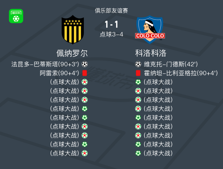 下半场补时第4分钟,佩纳罗尔球队阿雷索吃到红牌。
