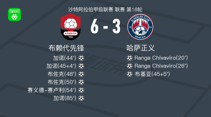 北京时间1月22日沙特阿拉伯甲级联赛 联赛 第18轮,布赖代先锋主场对阵哈萨正义。布赖代先锋加诺帽子戏法,布佐克梅开二度,赛义德-赛卢利破门。哈萨正义Ranga Chivaviro梅开二度,布基亚破门。最终比分布赖代先锋 6-3 哈萨正义。