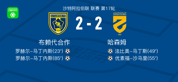 北京时间1月22日,沙特阿拉伯联赛第17轮,布赖代合作主场对阵哈森姆。罗赫尔-马丁内斯率先破门,帮助布赖代合作取得领先;随后法比奥-马丁斯为哈森姆扳平比分;不久后,法比奥-马丁斯送出助攻,优素福-沙马里破门反超;比赛尾声阶段,罗赫尔-马丁内斯再度破门,将比分定格为2比2。