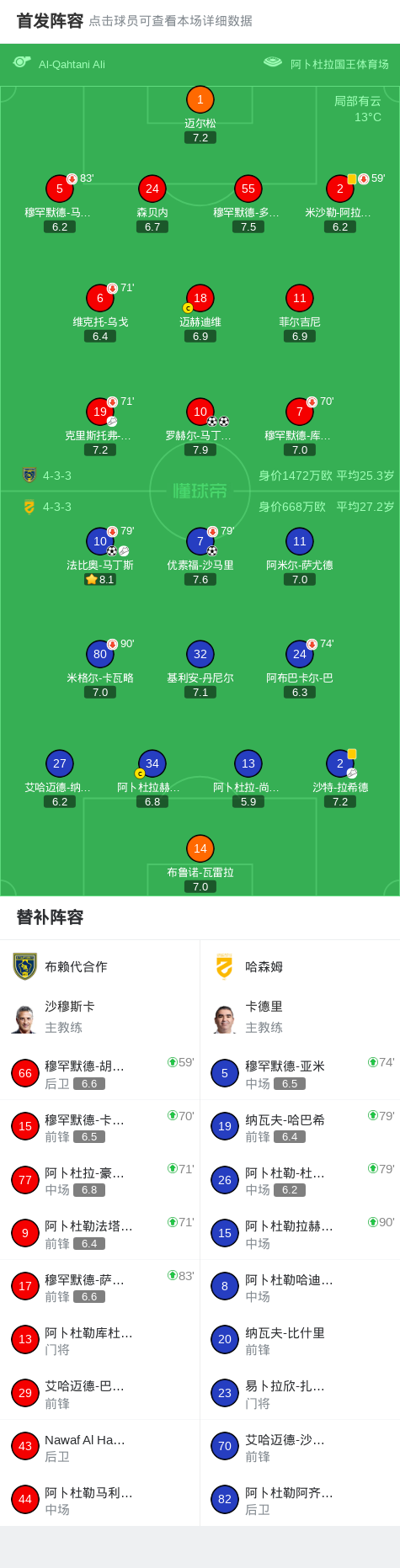 第49分钟,哈森姆球员沙特-拉希德助攻法比奥-马丁斯打入一球。