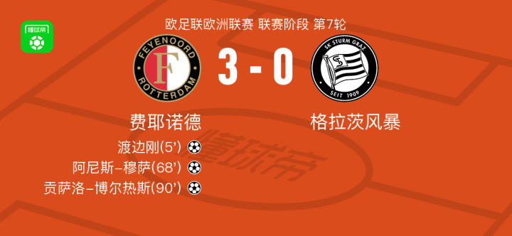 北京时间1月23日,欧足联欧洲联赛联赛阶段第7轮,费耶诺德迎战格拉茨风暴。比赛开始后,阿尼斯-穆萨送出助攻,渡边刚接球后冷静施射破门,为球队取得领先。此后,斯泰恩精准传球找到阿尼斯-穆萨,后者突破防线完成进球,进一步扩大优势。临近结束,沙奎尔-范佩西送出关键一传,贡萨洛-博尔热斯把握机会推射得手,锁定胜局。最终,费耶诺德以3比0战胜对手。