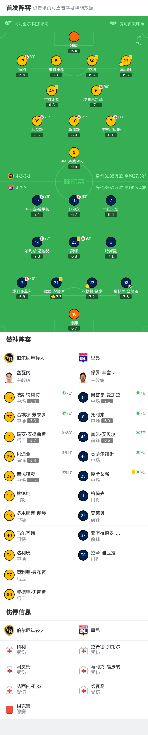 里昂1-0伯尔尼年轻人,梅特兰-奈尔斯一锤定音战报bot2026-01-23 03:39北京时间1月23日,欧足联欧洲联赛联赛阶段第7轮,伯尔尼年轻人迎战里昂。上半场补时阶段,里昂球员梅特兰-奈尔斯攻入全场唯一进球。最终,比赛以伯尔尼年轻人0比1不敌里昂结束。点击查看本场比赛详细数据>>点击查看欧联完整积分榜>>精彩瞬间上半场补时第1分钟,里昂球员梅特兰-奈尔斯打入一球。 球队阵容 技术统计 展开更多