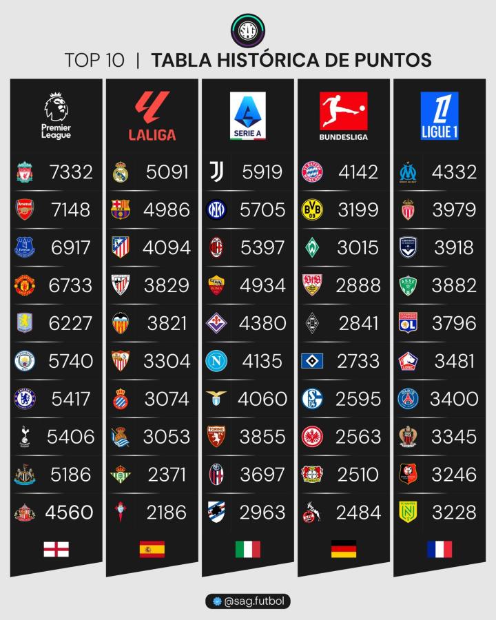 以下是欧洲五大联赛历史积分榜前十名的简要解析