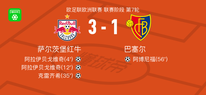 北京时间1月23日,欧足联欧洲联赛联赛阶段第7轮展开较量,萨尔茨堡红牛与巴塞尔展开对决。比赛开始后,阿拉伊贝戈维奇率先破门,为球队取得领先。随后,迪亚巴特送出助攻,阿拉伊贝戈维奇再入一球完成梅开二度。上半场临近结束前,克雷齐希接应进攻再度建功,进一步扩大比分优势。下半场易边再战,达尼柳克为阿博尼福送出精准传球,后者抓住机会扳回一城。此后双方均未能改写比分,最终全场结束,萨尔茨堡红牛以3比1战胜巴塞尔。
