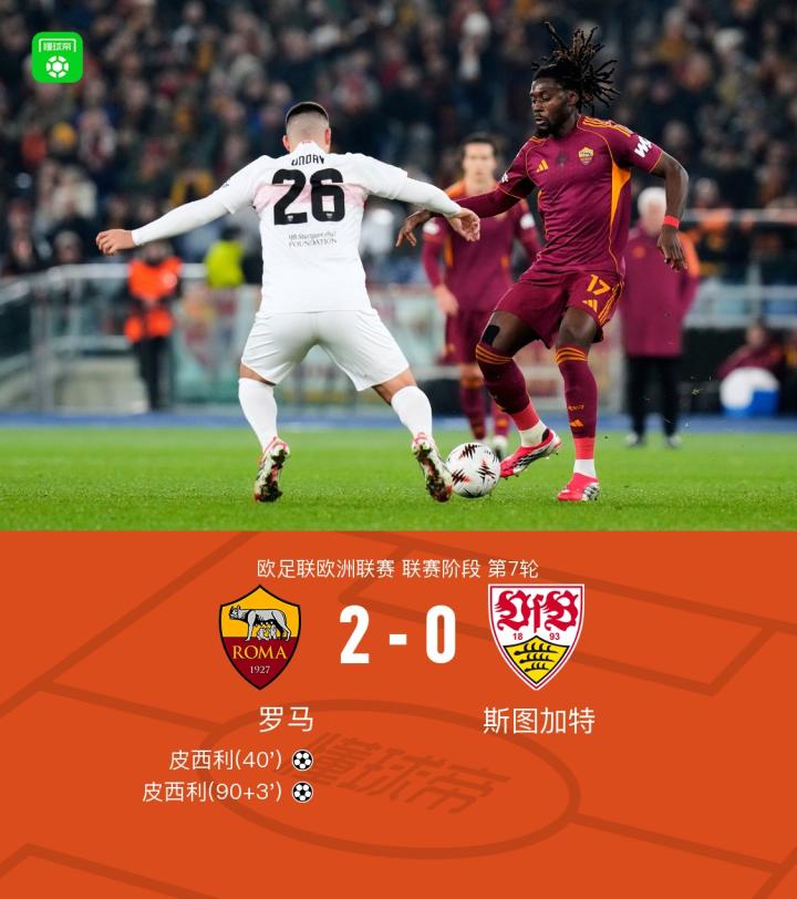 第90+3分钟,迪巴拉助攻,皮西利破门完成双响,罗马2-0斯图加特