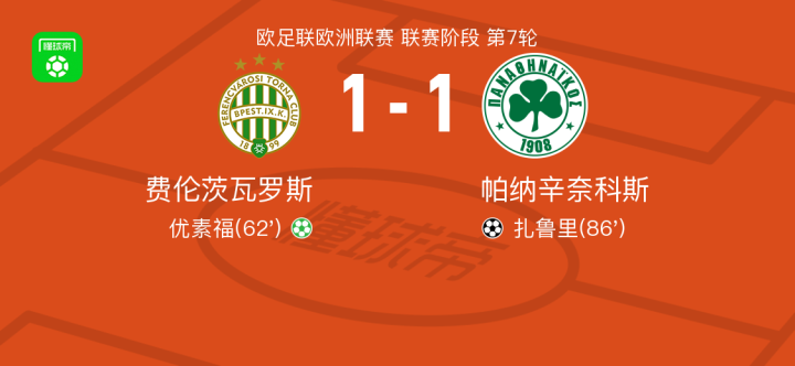 欧足联欧洲联赛联赛阶段第七轮,费伦茨瓦罗斯与帕纳辛奈科斯战成1比1平局。优素福主罚点球命中,为费伦茨瓦罗斯取得领先;扎鲁里接队友传球后破门,为帕纳辛奈科斯扳平比分。
