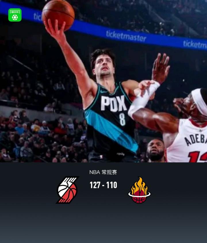第四节,开节热火加纳德、冯泰奇奥相继三分追至7分,紧跟开拓者夏普站出来里突外投势不可挡一波13-2再度拉大分差至18分,比赛最后3分钟热火无力反扑,全场结束,开拓者127-110战胜热火。