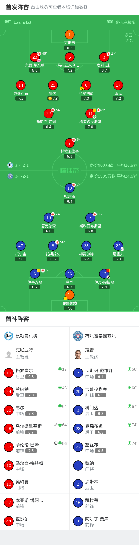 北京时间1月24日,德国足球乙级联赛第19轮,比勒费尔德主场对阵荷尔斯泰因基尔。比赛中,莱昂-施奈德不慎自摆乌龙,随后伊万-内基奇破门得分。上半场结束前,比勒费尔德由格罗多夫斯基罚入点球扳平比分。下半场,乌尔德里基斯送出助攻,萨伦伦-巴泽破门反超。最终双方2比2战平。