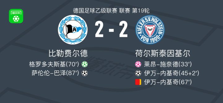 比勒费尔德2-2基尔,萨伦伦-巴泽建功,伊万-内基奇破门