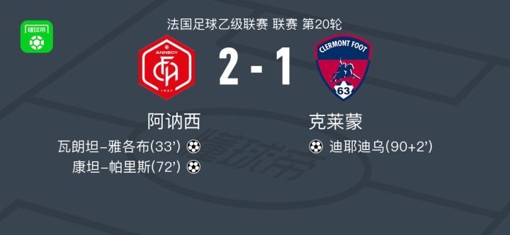 北京时间1月24日,法国足球乙级联赛第20轮,阿讷西主场迎战克莱蒙。瓦朗坦-雅各布接队友助攻破门,康坦-帕里斯随后再入一球。克莱蒙由迪耶迪乌攻入一球。最终阿讷西以2比1取胜。