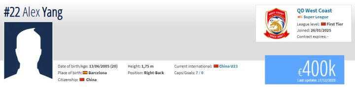 2025年1月26日,青岛西海岸足球俱乐部官宣杨希加盟球队。在2025年的中超比赛中我们能够看到,杨希在俱乐部球服上的印号并不是“ALEX YANG”或者“YANG A.”,而是根据中文拼音而印的“YANG X.”。