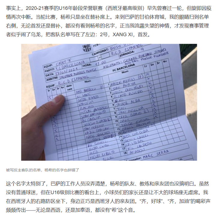 不过杨希在西班牙似乎也不是全都使用外语名字,体坛全媒体驻西班牙记者林德诺就曾在2021年写文章记录过一个趣事,他在观看2020-21赛季西班牙U16年龄段荣誉联赛西班牙人对阵巴塞罗那的比赛时,注意到杨希只是坐在替补席上,而比赛名单中并没有他的名字,后来才发现是赛事组写错了名字,把“YANG XI”写成了“XANG XI”,闹了一个不大不小的乌龙。