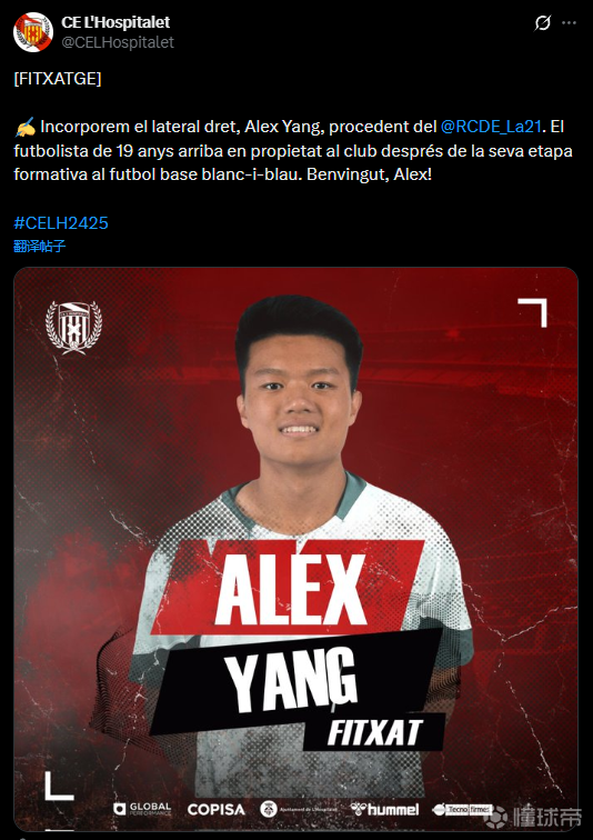 等到2024年5月,19岁的杨希与西班牙人俱乐部的合同到期,之后在八月份自由转会到了位于西丙联赛的奥斯皮塔莱特俱乐部。不过他在新俱乐部中并没有获得出场机会,因此我们也无从得知他在球服上所印的名字。