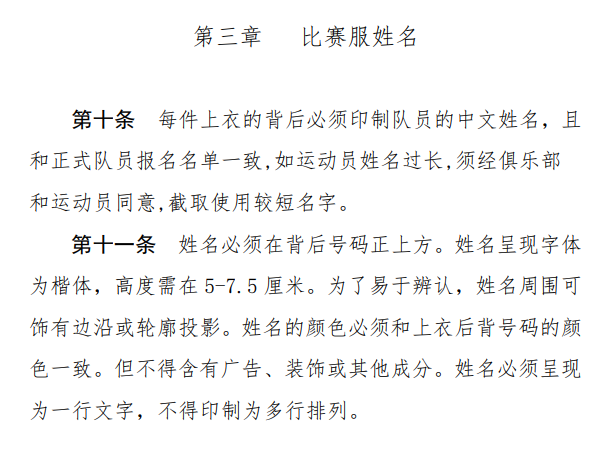 关于这点我们可以了解一下中国足协官方文件中关于比赛服姓名的规定,由于我没有找到中超联赛的相关文件,所以在此以2019年发布的《中甲联赛装备规定》以及《2025中国足球协会会员协会冠军联赛秩序册》中的内容作为参考,其中提到:每件上衣的背后必须印制队员的中文姓名,且和正式队员报名名单一致,如运动员姓名过长,须经俱乐部和运动员同意,截取使用较短名字。