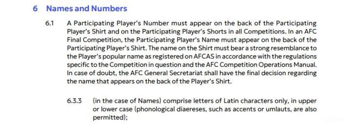 而在2025版本的《亚足联装备规定》中则提到:在亚足联各项赛事的决赛圈阶段比赛中,参赛球员的姓名必须出现在球衣背面,球衣上的姓名必须与球员在亚足联官方注册系统(AFC Administration System)中注册的常用名高度一致,且只能使用拉丁字母的大小写进行拼写。如有疑问,亚足联秘书处对球衣背面显示的姓名拥有最终决定权。