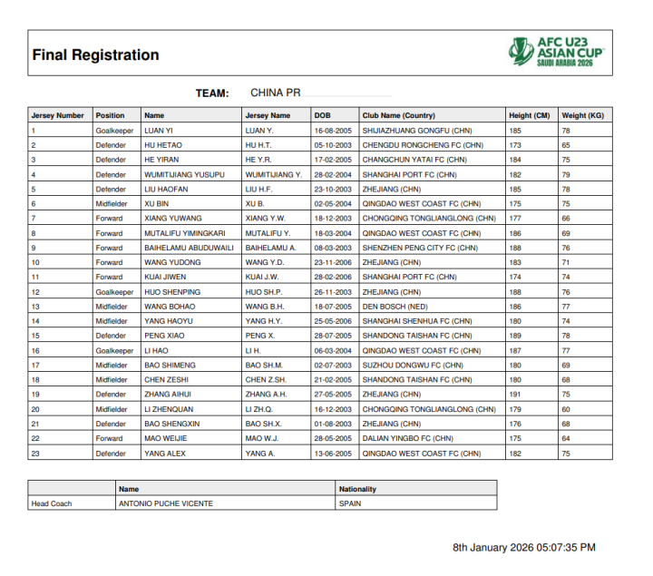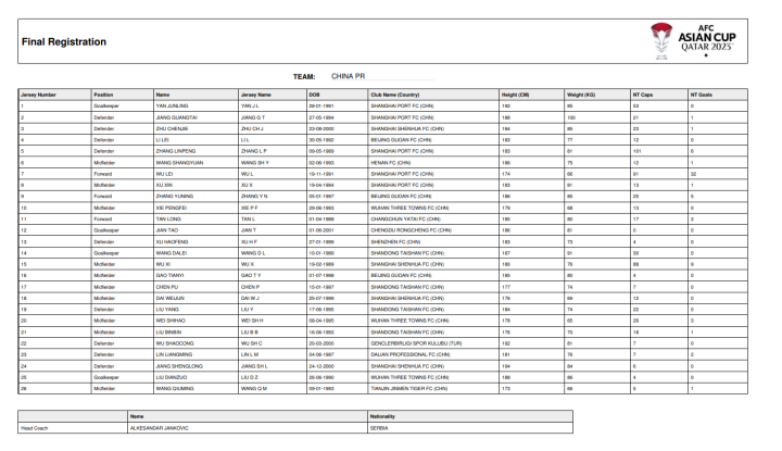 同样作为参考,我们再来看一下2023年亚洲杯的球队注册文件。在这份文件中,我们的入籍球员蒋光太在注册时使用的是自己的中文名字,所以他球衣上印的是“JIANG G.T.”,而不是以前在英格兰效力埃弗顿时期所印的外语名字“BROWNING”。中国队另一位出生在香港的球员戴伟浚也使用了汉语拼音名字进行注册,因此他球服上的名字是“DAI W.J.”,而如果使用香港政府粤语拼音的拼法,他印在球衣上的名字大概会变成“DAI W.T.(Dai Wai Tsun)”。