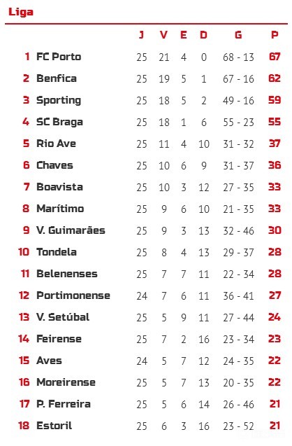 前9位都没有任何的变化,波尔图继续以5分优势领跑,帕索斯-费雷拉和埃斯托里尔落入降级区。