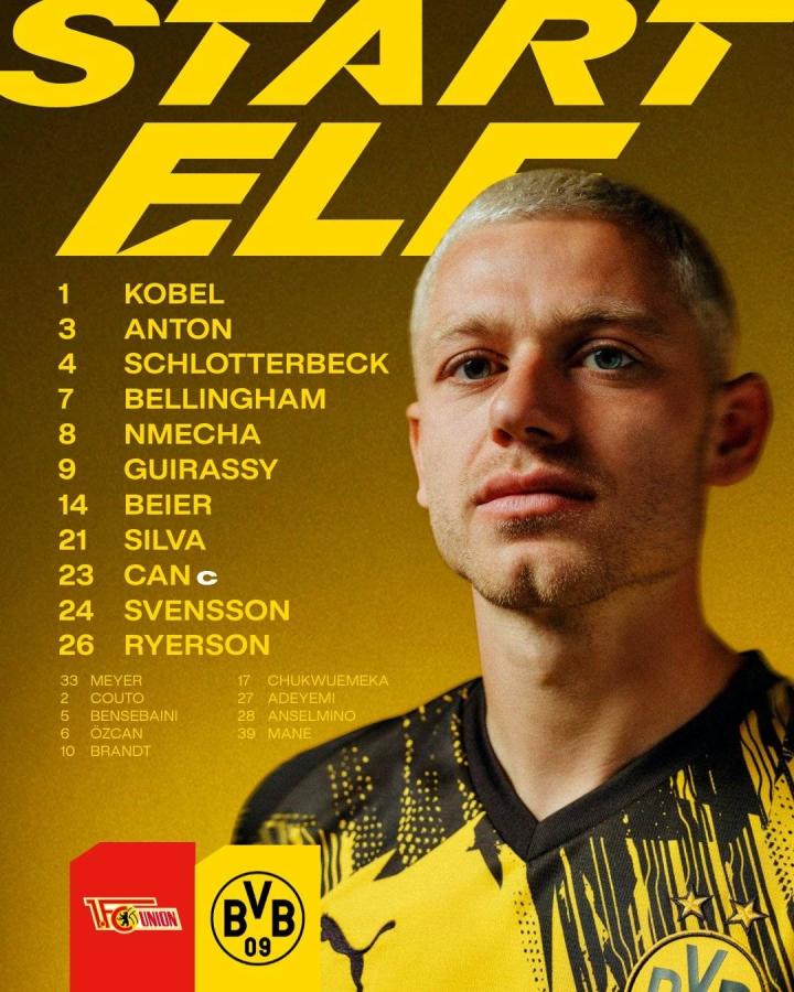 多特蒙德首发:1-科贝尔、4-施洛特贝克、3-安东、24-丹尼尔-斯文松、23-埃姆雷-詹、14-拜尔、8-费利克斯-恩梅加、7-乔布-贝林厄姆、26-瑞尔森、21-法比奥-席尔瓦、9-吉拉西
